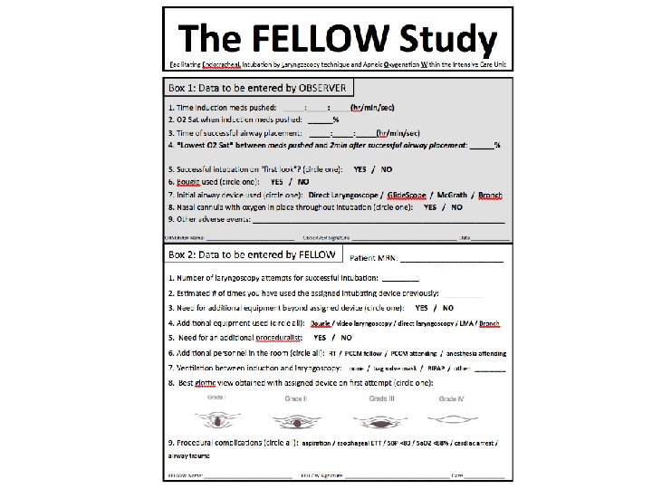FELLOW Study Design • Open-label, parallel-group, randomized trial • Video Laryngoscopy vs. Direct Laryngoscopy • Inclusion: – 18 or older – being intubated by PCCM fellow • Exclusion: – awake intubation – too emergent to open study envelope – specific laryngoscope required