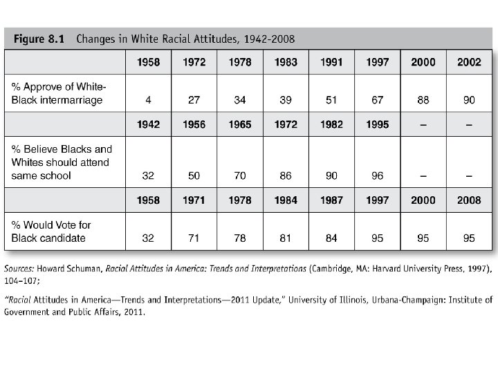 Race, Ethnicity, and Public Opinion • Measuring Racial Attitudes: Political and other social scientists are concerned with whether or not survey or poll questions properly measure how race impacts individual political attitudes: • Explicit Racial Attitudes: These are where respondents hold racially prejudicial or even racist views against others groups such as when Whites oppose Whites and Blacks marrying, attending school together, or oppose voting for Black candidates. (see Figure 8. 1 next slide) • Implicit Racial Attitudes: These are subconsciously held negative biases or prejudicial feelings about other groups that don’t involve cognitive, rational thought but are based more on emotions and feelings such as likability, sympathy, fear, or disgust. Police officers who shoot unarmed Black and other minority youth may be acting out of these implicit biases.