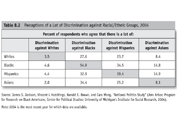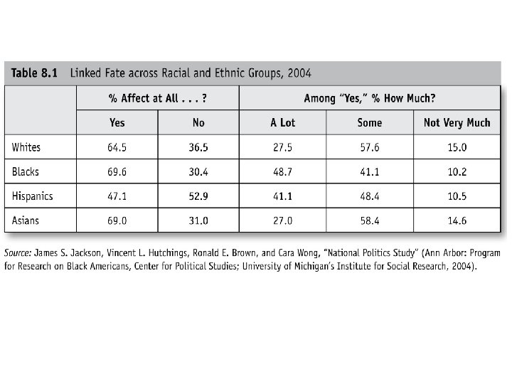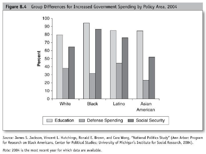 The Political Impact of Racialization • Race as a liberalizing factor: The Group Position Model helps to explain how racial and ethnic minorities such as African Americans, Latinos, and Asian Americans often perceive that they (or other minorities) uniquely suffer from racial discrimination as compared to Whites. This perceived discrimination appears to liberalize minority policy views and views about the proper role of government in American society. (see Figure 8. 4 next slide)