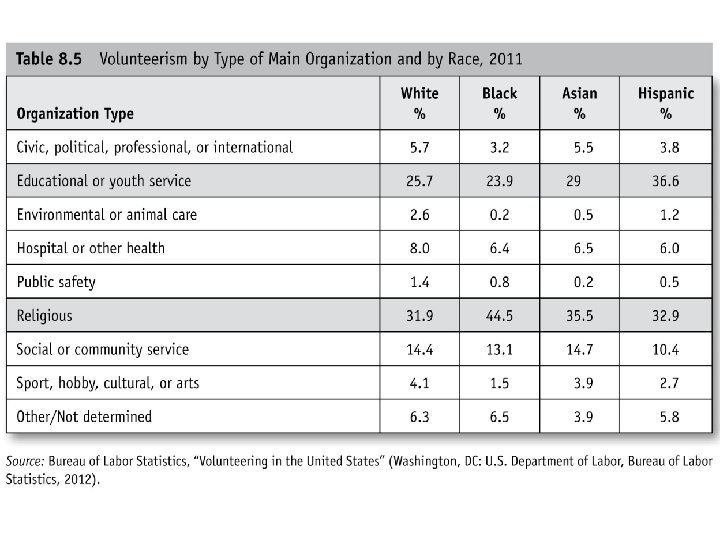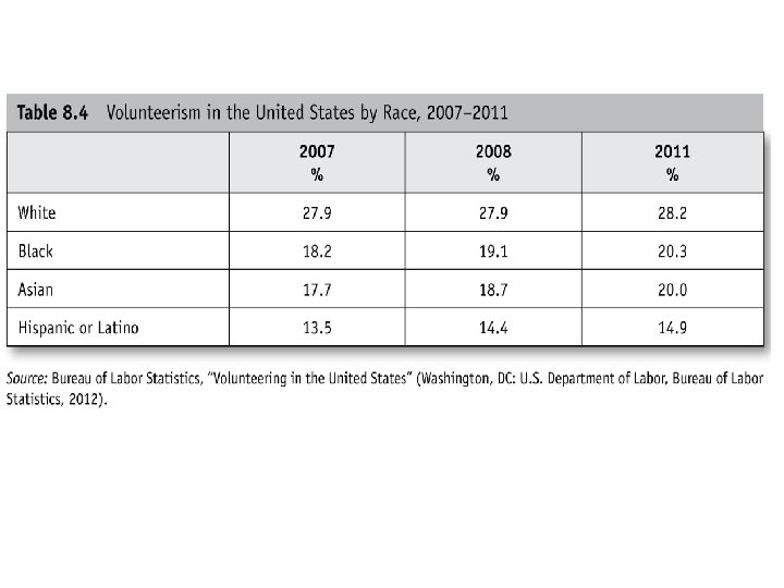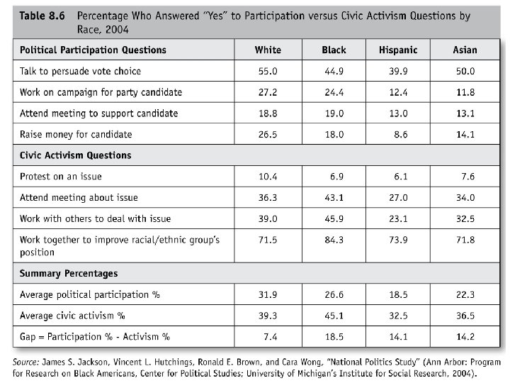 Activist Pathways to Empowerment • Civic Activism and Race: Whites report higher levels of overall volunteering as compared to racial/ethnic minorities. (see Table 8. 4 next slide) But African Americans and Hispanics report higher levels of involvement in religious organizations and Asian American report similar levels (see Table 8. 5). Whites are likely to engage in conventional forms of political participation (. e. g. working for a campaign or raising money for a candidate), but African Americans, Hispanics, and Asian Americans are more likely to engage in civic activism (. e. g protest, attending meetings about issues, working with others about a problem. ) (see Table 8. 6) • Social Capital & Costs: All participation has a cost of how much time or money or effort they require. Some are “low” like talking politics to friends to “high” like protest and civil disobedience that my lead to arrest. Social capital are the social bonds of trust that develop in groups like churches or community groups that may help minorities whether the cost of activities such as voting or protesting.