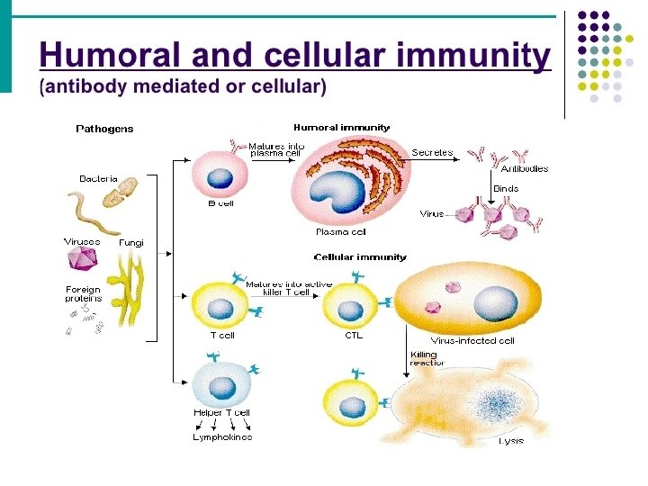 The Humeral Response • Involves most cells and responds to antigens or pathogens - B cells produce plasma cells - B cells produce memory cells - Macrophage and helper T cells stimulate the production of additional B cells