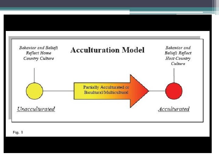 Definition • Acculturation is a process in which members of one cultural group adopt the beliefs and behaviors of another group – food, music, language, sports, etc. • Measurement: ▫ Acculturation Scales