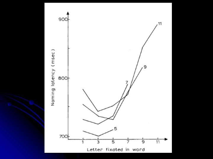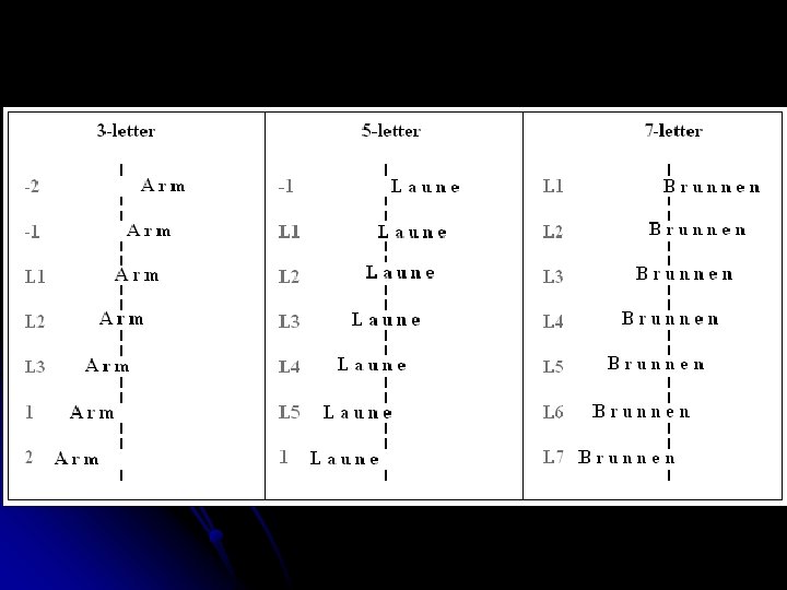 OVP-curve and cerebral dominance (Münster study) l German nouns of 3 -, 5 and 7 -letters (controlled for freq. and neighbourhood size) l Presentation: l 7 possible fixation locations shifted across the screen l 630 stimuli l randomised order Presentation 180 ms l
