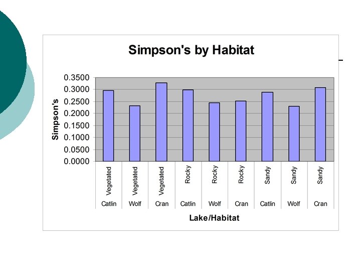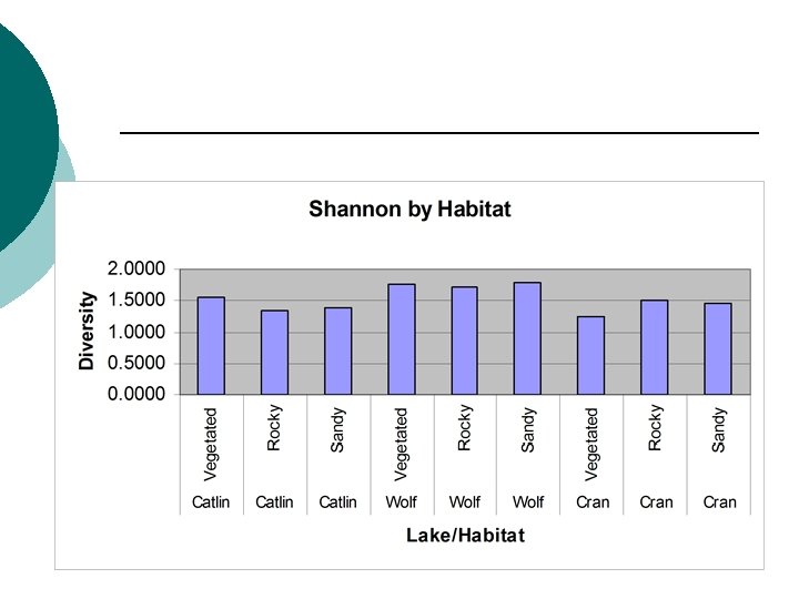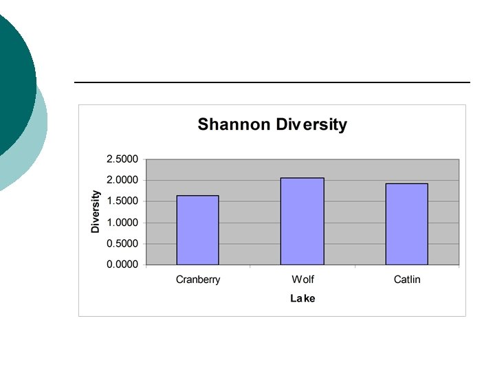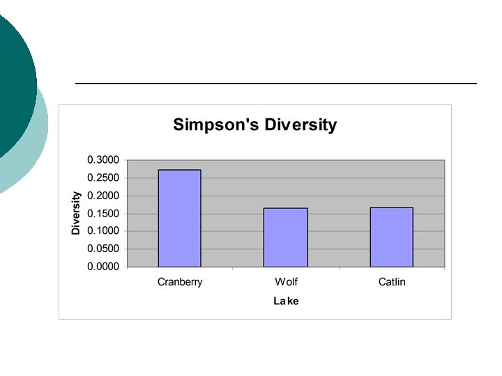 Diversity Results Wolf Lake highest richness ¡ Wolf Lake highest Shannon Diversity (eveness considered) ¡ Cranberry highest Simpson’s ¡