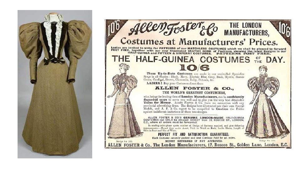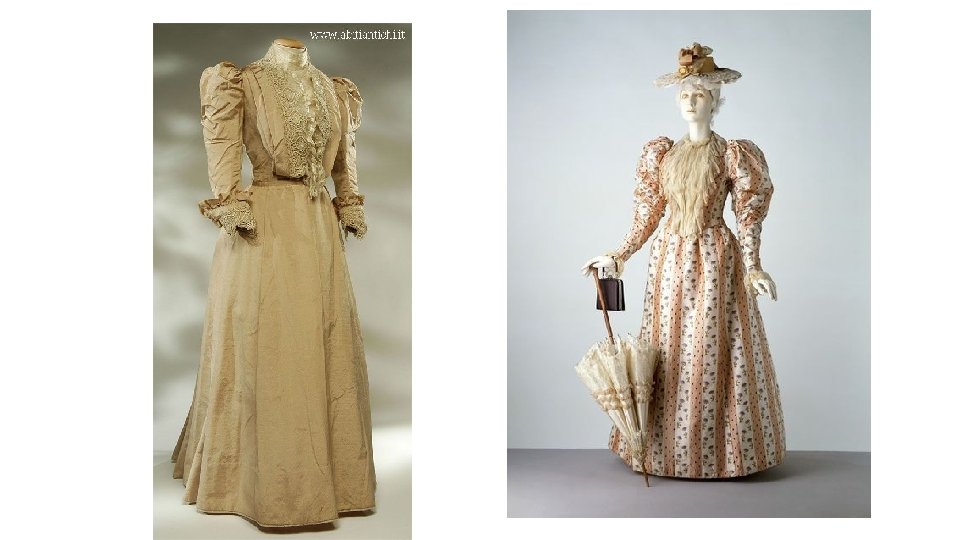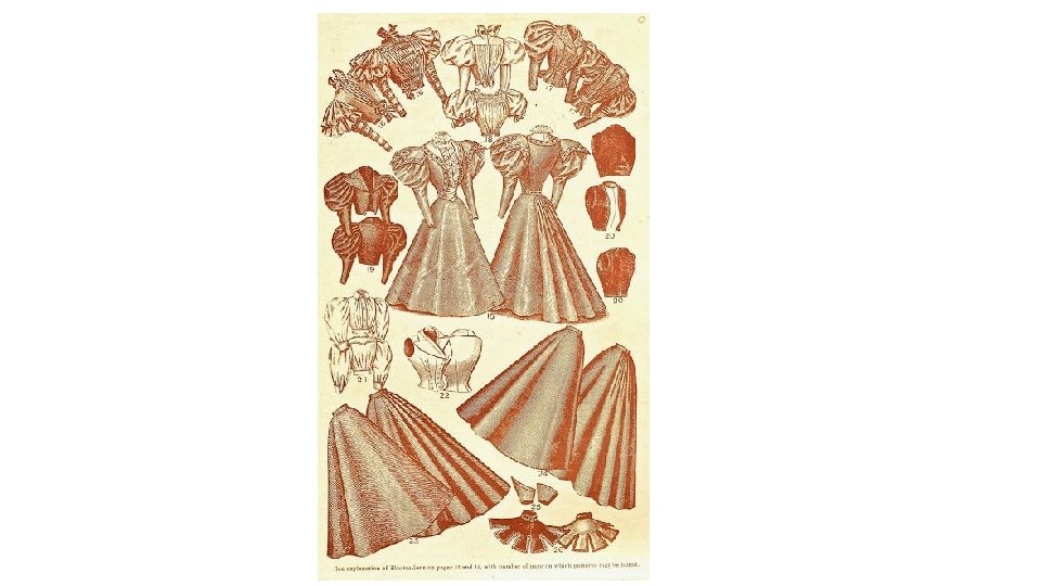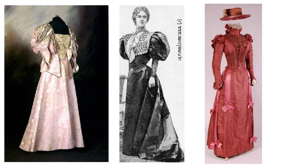 Women’s wear • In general, fashion is about mass, think tight versus loose groupings of fabric. These masses reflect the mode of a period. Throughout the 1800 s, masses of fabric moved all over the body. Hoop skirts, bustles, bum-rolls, corsets, big hats, enormous sleeves – all of these added to the silhouette of the age. • Our time, 1895 (ish), the general shape was an hourglass – tiny waist, laaaaaarge shoulders, and a bell shaped skirt. • The bodice was the most decorated part of the ensemble • The tiny waist was caused by corsetry