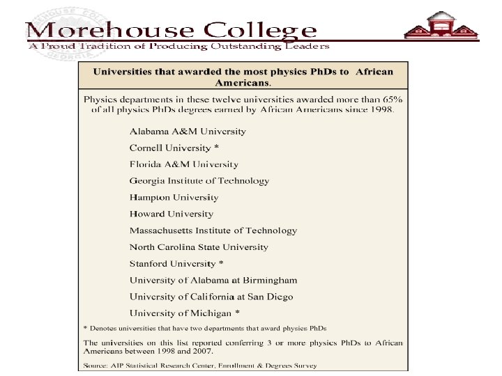 Only 185 of 4500 physics baccalaureates are awarded to African Americans Greater than 50% of those degrees are awarded by 36 HBCU programs Many of the nation’s 780 physics programs have never graduated an African American physics major. Many never will.