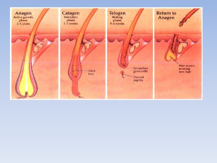 Telogen Phase (follicle resting phase) • lasts 2 -6 months • 8 -10% of hair • hair is not growing, but remains attached to the follicle while the dermal papilla is in a resting phase below • naturally shed hair has a club shape root