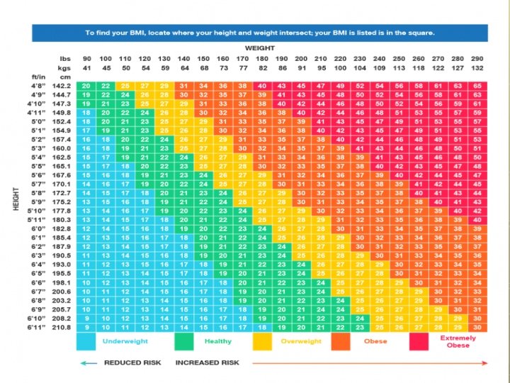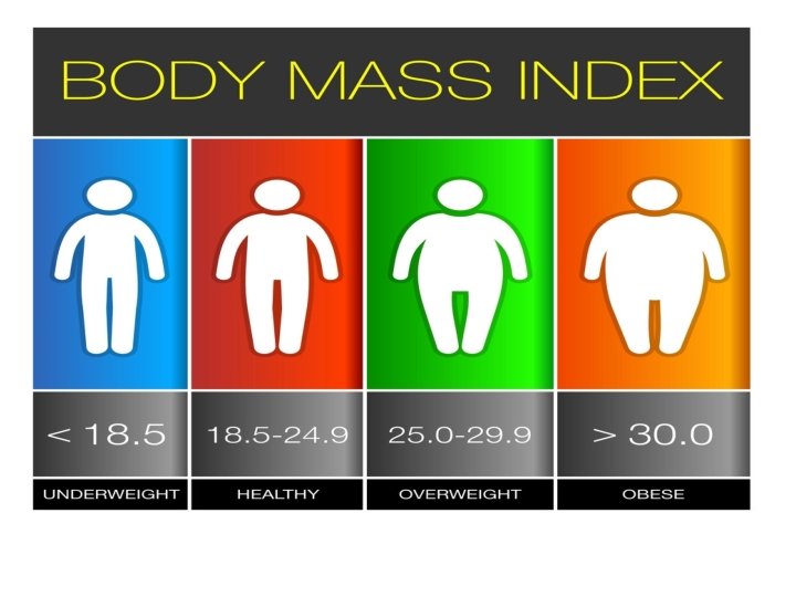 BMI Body mass index or BMI, identifies if an individual is a healthy weight for their height Weight in kilograms divided by height in metres squared = BMI Underweight: BMI is less than 18. 5 Normal weight: BMI is 18. 5 to 24. 9 Overweight: BMI is 25 to 29. 9 Obese: BMI is 30 -39. 9 Morbidly Obese: BMI over 40