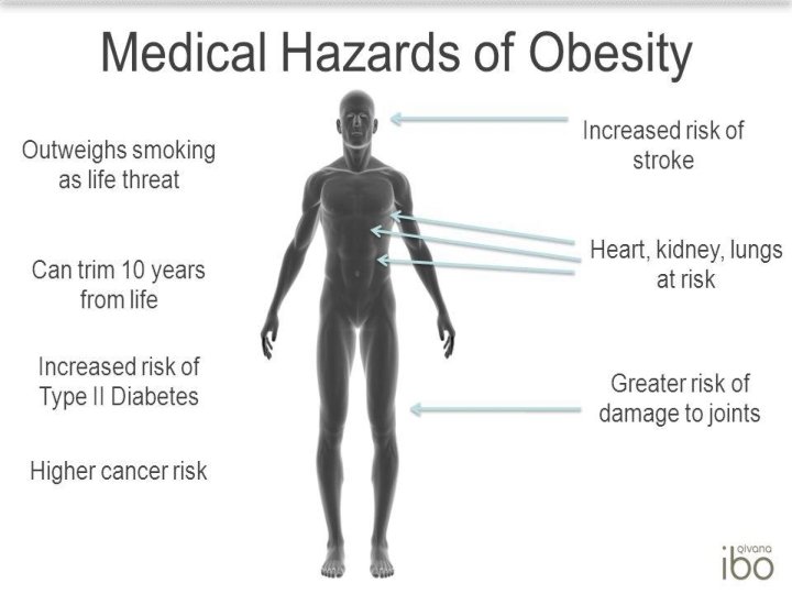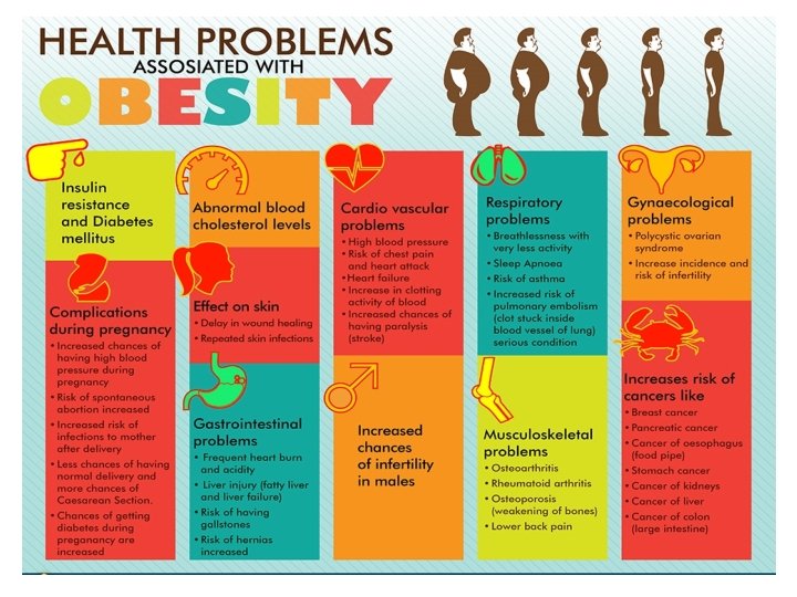 What to do? Speak to the GP, or medical professional if overweight Importance of incorporating and maintaining a healthy well balanced diet and physical activity Activity: walking, cycling, swimming etc Start slowly and build up the level of activity Make a habit of it. Do the same activity at a moderate intensity for a set amount of minutes most days of the week When you get used to this, increase the time you spend doing the activity Then increase the intensity at which you do it Try out different activities for variety