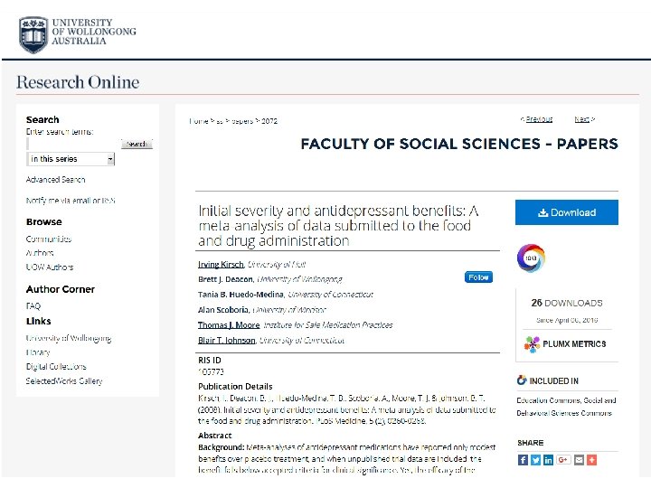 Impact - Examples • High usage, external to RO – https: //ro. uow. edu. au/sspapers/2072 • High citations + high downloads, reflecting the importance of RO – https: //ro. uow. edu. au/scipapers/1259 • High social media count, low citation figures – https: //ro. uow. edu. au/smhpapers/4652