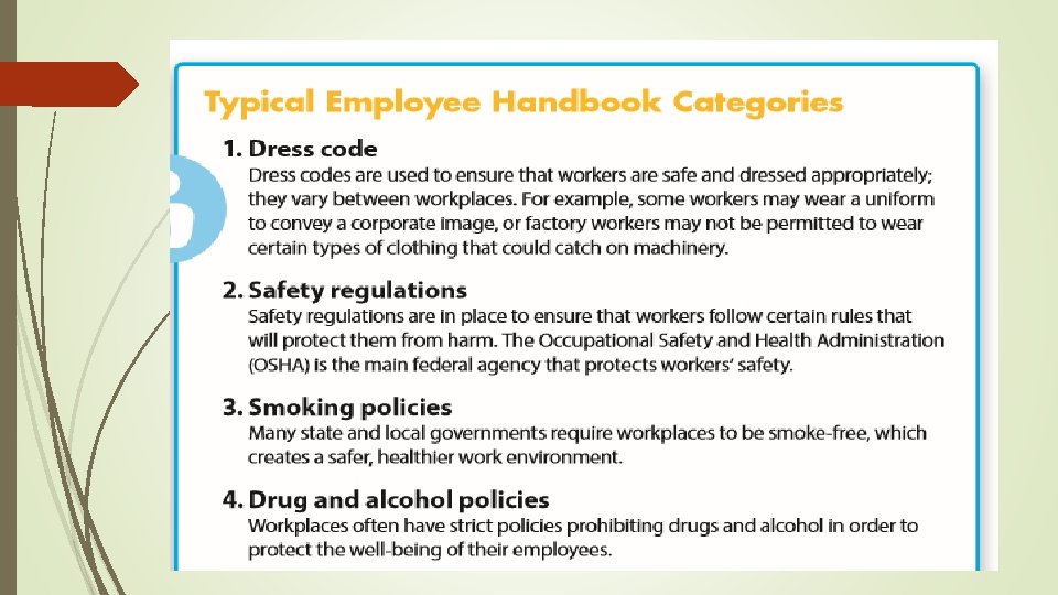 How Government Regulates the Workplace Regulatory Agencies Department of Labor – oversees wages and hour, employer obligations, employee rights, and occupational safety. Occupational Safety and Health Administration (OSHA) – part of the Department of Labor, they enforce standards for workers, but also provides workplace safety training and education. Equal Employment Opportunity Commission (EEOC) – enforces federal laws prohibiting employment discrimination: Unfair treatment for any reason Harassment Denial of reason workplace accommodations Retaliation