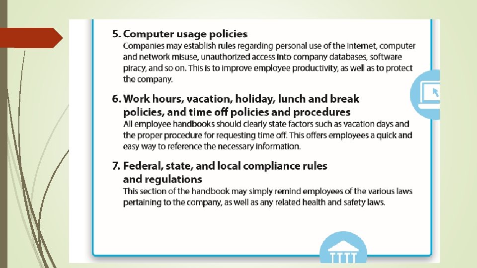 Rules & Regulations in the Workplace Company Policies and Procedures Set by companies and are established to: Comply with all federal, state, and local regulations and laws Keep employees safe Reflect the company’s mission statement and overall identity Maintain the reputation and credibility of the company
