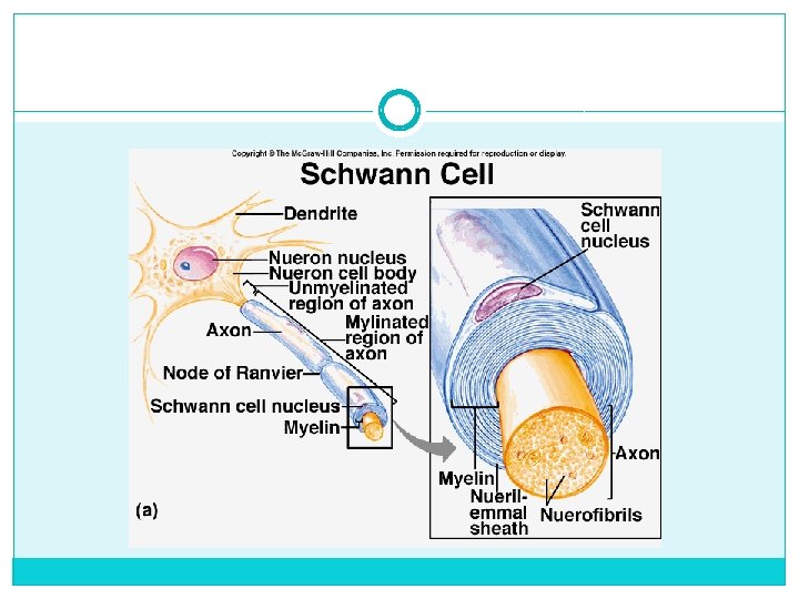 Neuron Support System �Glial cells: structural support and metabolism of nerve cells �Schwann cells, form layers of membrane called myelin sheaths around axons, gaps between Schwann cells, called nodes of Ranvier, expose axon membrane to extracellular fluids speeds up the rate of electrical impulses �Division and brain tumors