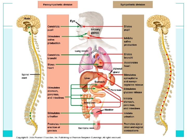 Organization of the Nervous System �Autonomic System sympathetic and parasympathetic divisions �Sympathetic: dominates during stress, danger, excitement or physical activity �Parasympathetic: dominates during quiet, lowstress situations, such as relaxation