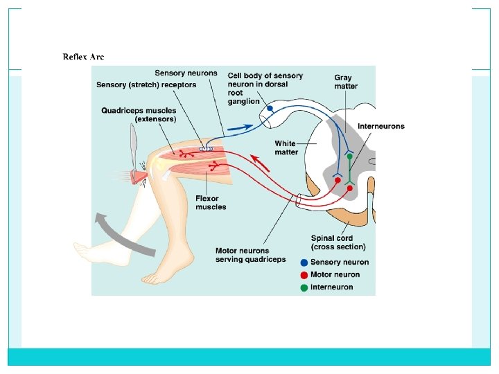 Reflex Arc �Neural circuit 5 components: receptor, the afferent neuron, the interneuron, the efferent neuron, and the effector �Reflex arc: travels through spinal cord, but does not require coordination from brain �Ex: when your finger touches a very hot object