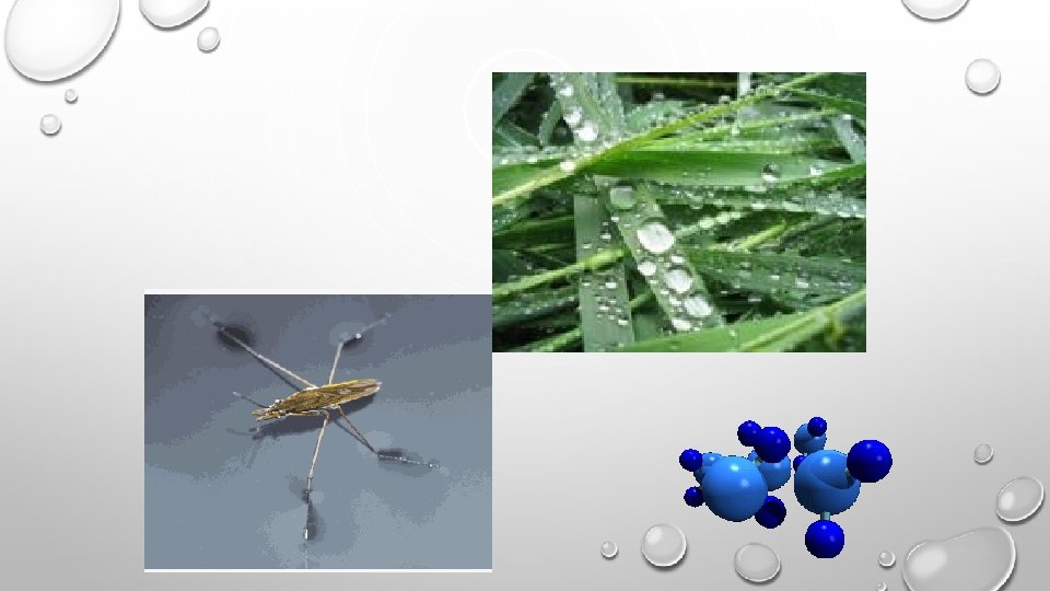 COHESION- AN ATTRACTION BETWEEN MOLECULES OF WATER • THE RESULT: • WATER MOLECULES STICK TO EACH OTHER • SURFACE TENSION: WATER MOLECULES ARE DIFFICULT TO BREAK APART, THEREFORE IT APPEARS AS THOUGH WATER MOLECULES CREATE A FILM ON THE SURAFCE