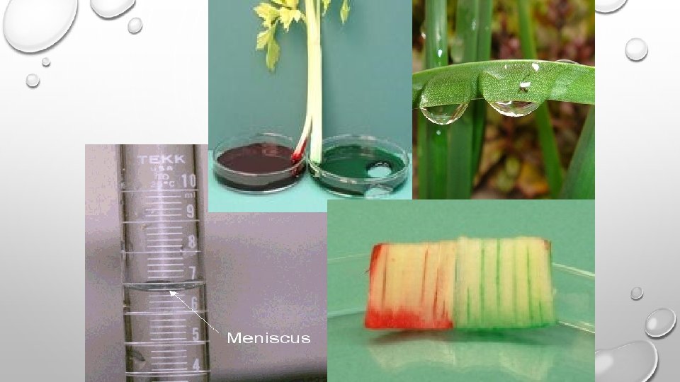 ADHESION- AN ATTRACTION BETWEEN MOLECULES OF DIFFERENT SUBSTANCES. • THE RESULT: • WATER MOLECULES STICK TO GLASS OF GRADUATED CYLINDER FORMING THE MENISCUS. • CAPILLARY ACTION- FORCE THAT DRAWS WATER UP AGAINST GRAVITY IN ROOTS OF PLANTS.