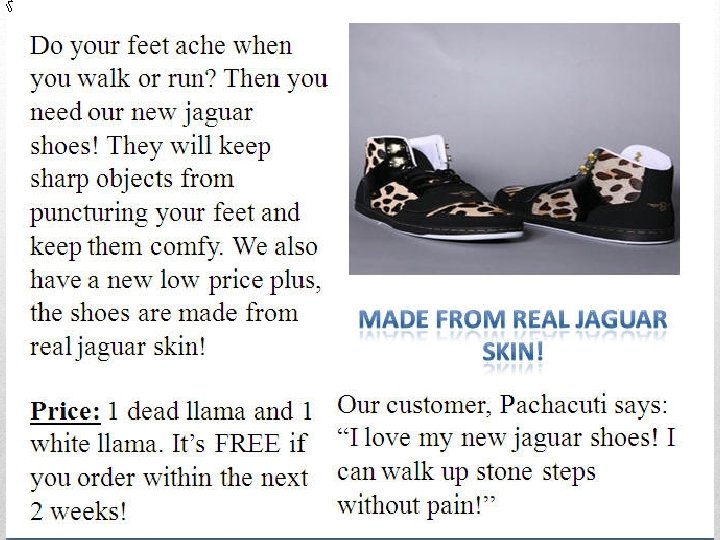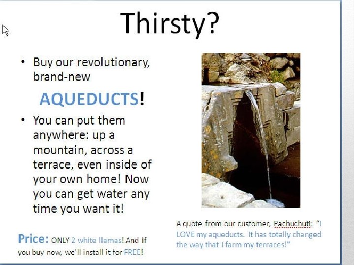 History Advertisement… • Your Task: Create an advertisement for a technological advance in the Inca civilization. This should be a 1 page advertisement that could be in a magazine or newspaper. • Advertisement must include: • Colorful drawing • Why people should be interested… • Price • List of what the item does • “Quote” from an Inca living at the time • Choose one of the following: • Quipu, terrace, jaguar, aqueduct, runner