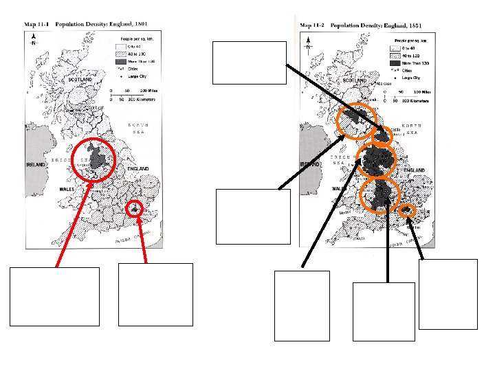 QUESTION 1: In 1801 the British population mainly concentrates around Liverpool and London. Liverpool was a commercial crossraos and London the capital In 1851 the situation is different: the UK is far more populated: densities have increased everywhere. This is linked with step one of the demographic transition. Moreover, If Liverpool and London remain popuation centers, others emerged: in Scotland around Glasgow, in Newcastle in the North-East and in the South a densily populated strip can been seen from Liverpool to Bristol.