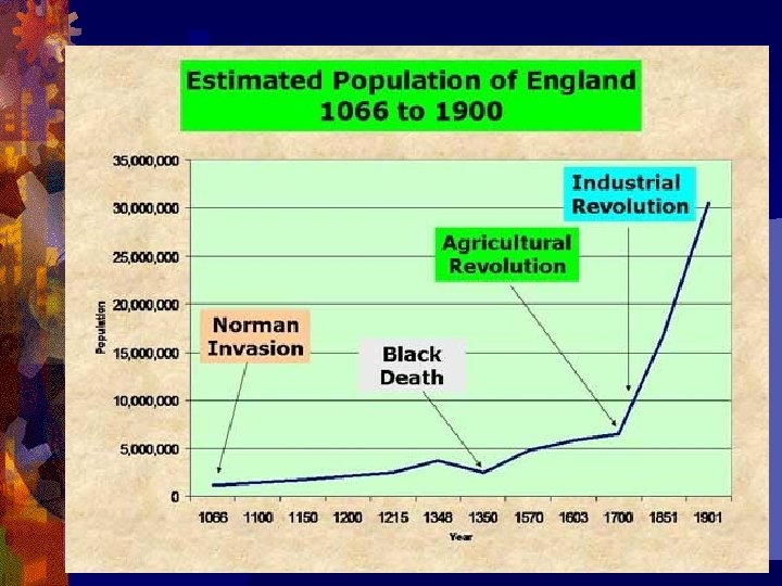 3. Result: a. As food supplies increased and living conditions improved, England’s population grew very fast. b. An increasing population boosted the demand for food and goods such as cloth. c. Farmers who lost their land became factory workers.