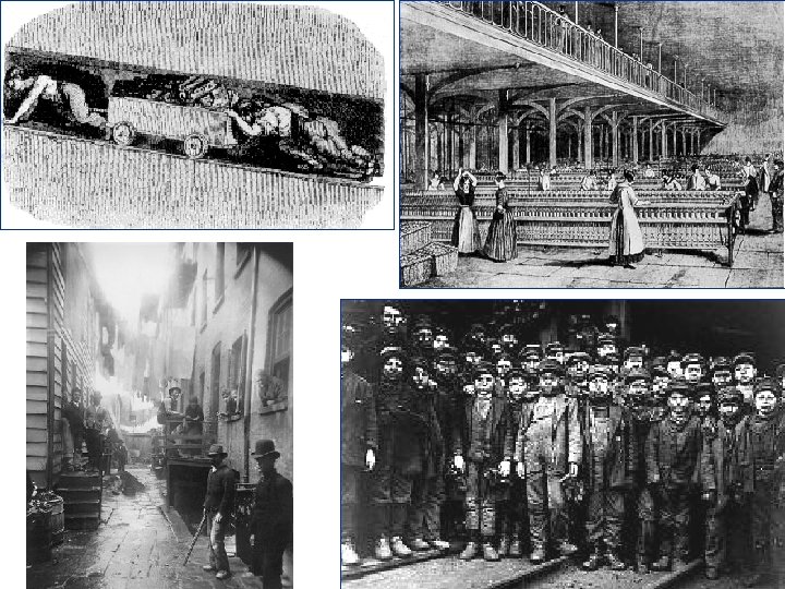 Hardships in New Industrial Cities I. Urbanization: rapid growth of cities causes overpopulation and infrastructure issues. - Poor/lower class forced to live in slums – tenement housing (multistory apt buildings with tiny rooms) – no running water, sewage, or sanitation. - 12 -16 hr shifts with no breaks in dangerous conditions (fingers and limbs were often lost) and bad air quality - Women – cheaper and easier to manage (exploited). - Children – cheaper and could get into small places