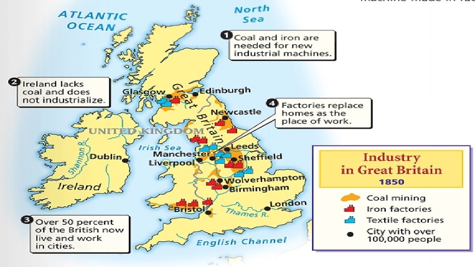 Industrialization Outside Britain • Germany was political divided into smaller principalities • Lead to pockets of industrialization • Large deposits of coal and iron ore • By the mid-1800 s one of the worlds industrialized powers • United States • Cotton boom in the south lead to northern textile mills • Post Civil War- US becomes a leader in railroads, oil, steel, and electricity