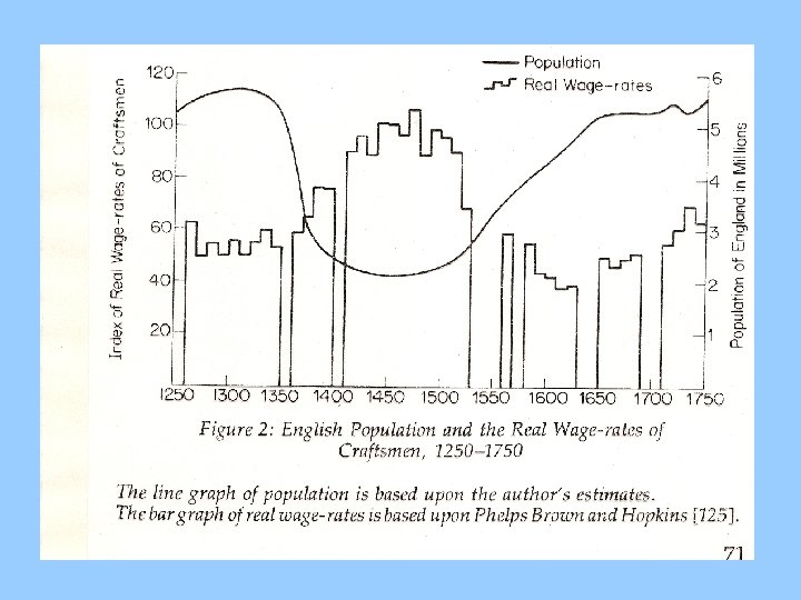 Simple Model: (1) equilibrium? (2) technological innovation? (3) harvest failure? Real Wage Population Real Wage Births W 0 Deaths Demand for Labor Population Birth Rate, Death Rate