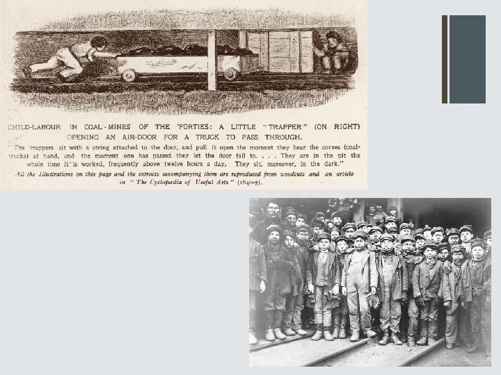 + Factory Life n Hired mostly children/women (cheaper) n Children as young as 7 worked n Wanted children because they’re small enough to get into and repair machines n 12 -16 n High hour workdays/6 days a week rate of injury/death n Factory owners became very wealthy