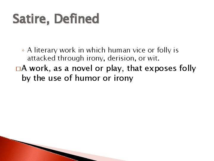 Satire, Defined ◦ A literary work in which human vice or folly is attacked through irony, derision, or wit. �A work, as a novel or play, that exposes folly by the use of humor or irony