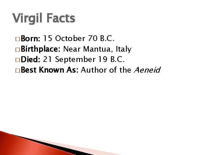 Virgil Facts � Born: 15 October 70 B. C. � Birthplace: Near Mantua, Italy � Died: 21 September 19 B. C. � Best Known As: Author of the Aeneid