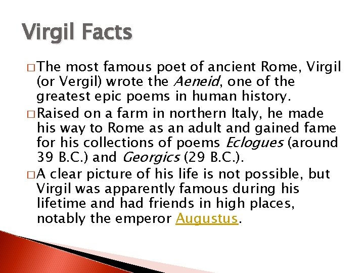 Virgil Facts � The most famous poet of ancient Rome, Virgil (or Vergil) wrote the Aeneid, one of the greatest epic poems in human history. � Raised on a farm in northern Italy, he made his way to Rome as an adult and gained fame for his collections of poems Eclogues (around 39 B. C. ) and Georgics (29 B. C. ). � A clear picture of his life is not possible, but Virgil was apparently famous during his lifetime and had friends in high places, notably the emperor Augustus.