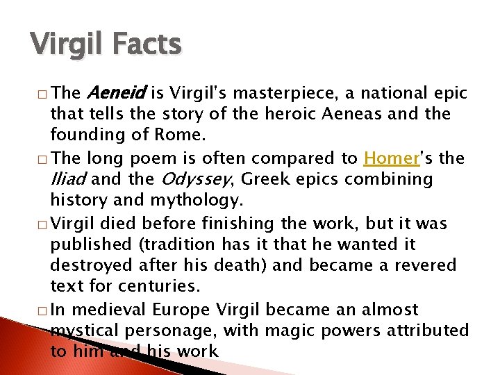 Virgil Facts � The Aeneid is Virgil's masterpiece, a national epic that tells the story of the heroic Aeneas and the founding of Rome. � The long poem is often compared to Homer's the Iliad and the Odyssey, Greek epics combining history and mythology. � Virgil died before finishing the work, but it was published (tradition has it that he wanted it destroyed after his death) and became a revered text for centuries. � In medieval Europe Virgil became an almost mystical personage, with magic powers attributed to him and his work