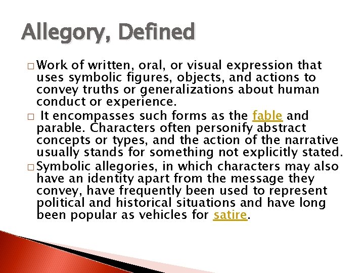 Allegory, Defined � Work of written, oral, or visual expression that uses symbolic figures, objects, and actions to convey truths or generalizations about human conduct or experience. � It encompasses such forms as the fable and parable. Characters often personify abstract concepts or types, and the action of the narrative usually stands for something not explicitly stated. � Symbolic allegories, in which characters may also have an identity apart from the message they convey, have frequently been used to represent political and historical situations and have long been popular as vehicles for satire.