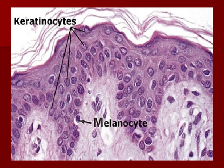 n Synthesizes melanin 2) the pigment Melanocytes n Melan-black n Can transfer melanin to keratinocytes n Protects skin from ultraviolet light. Sun stimulates production of melanin- tanning n Freckles & moles are accummulated melanin melanocyte Melanin in keratinocytes