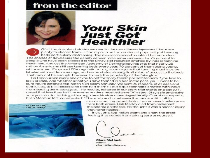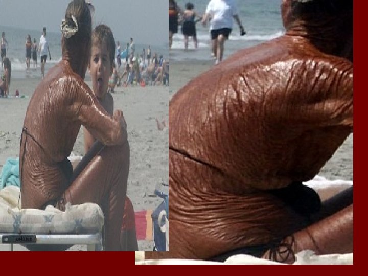 Homeostatic imbalance & the SUN n Despite melanin’s protective effects excessive sun exposure eventually damages the skin. It causes the elastic fibers to clump, leading to leathery skin. n It also depresses immune system. Those infected with the herpes simplex, or cold sore, virus are more likely to have an eruption after sunbathing. n DNA can also be altered leading to skin cancer.