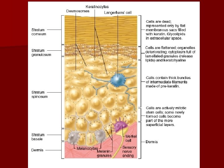 What are the different types of cells in the epidermis? 1) Keratinocytes (covering) 2) Melanocytes (color) 3) Langerhans’ cell (immunity) 4) Merkel cells (receptors)