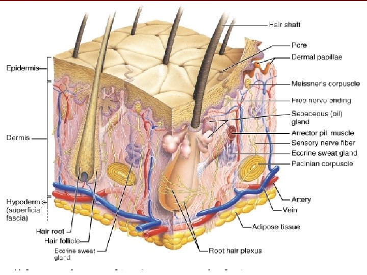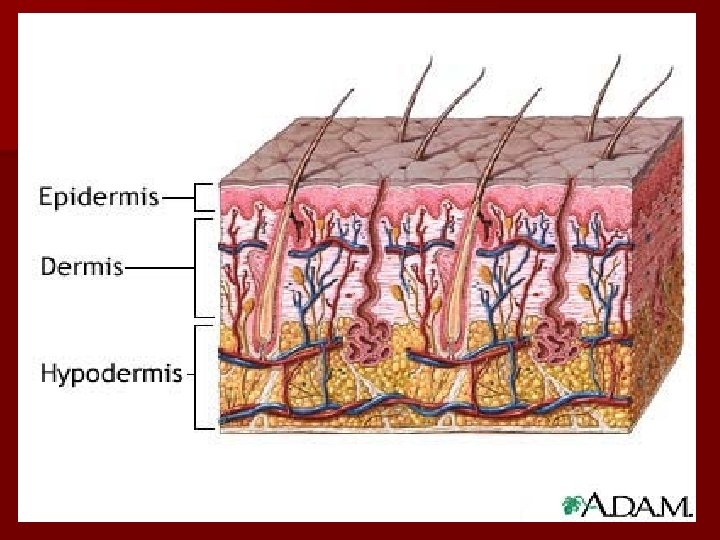 What are the major layers of the skin? n Epidermis (epi-upon) Composed of epithelial tissue (stratified squamous) Non-vascularized n Dermis – underlies the epidermis Tough leathery layer composed of fibrous connective tissue, blood & lymph vessels, sensory Tissue and glands (sweat & sebaceous) n Hypodermis (not considered skin) – Made of adipose and areolar tissue – Stores fat, anchors skin, protects against blows