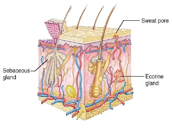 What are the major appendages of the skin? n Sweat glands What is sweat: water, salts, vitamin C, urea & even lactic acid It is acidic with a p. H from 4 -6 n Sebaceous glands n Hairs n Nails