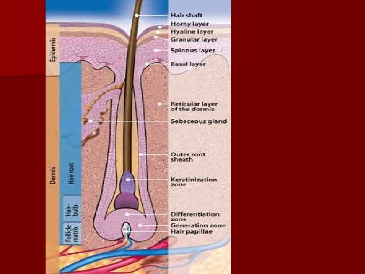 What are hairs? n Made from hair follicles n Made of dead keratinized skin cells n Two parts shaft and root n Shaft has 3 layers of cells – Medulla(central core) – Cortex (bulky layer) – Cuticle (heavily keratinized; protects hair)