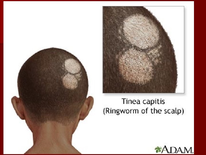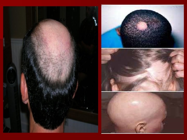 ALOPECIA- LOSS OF HAIR n DUE TO ANXIETY, PROTEIN DEFICIENT DIETS, THERAPIES LIKE CHEMOTHERAPY, RADIATION, EXCESSIVE VITAMIN A, CERTAIN FUNGAL DISEASES (RINGWORM), IMMUNITY, n MAY ALSO BE DUE TO GENETICS AS IN MALE PATTERN BALDNESS (ANDROGENETIC ALOPECIA) n RECENT STUDIES HAVE INDICATED THE CHROMOSOME # 20 AND THE X AS CONTRIBUTERS TO GENETIC ALOPECIA