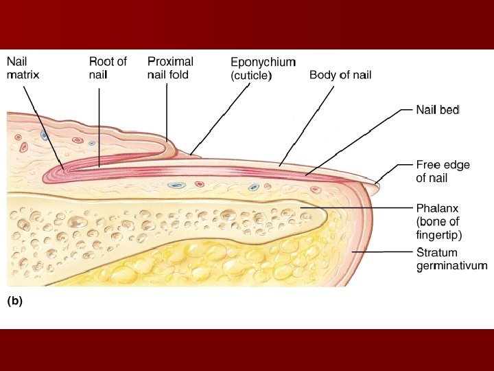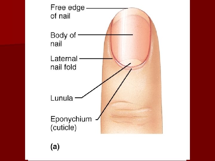 What are the parts of nails? n. A nail is a scale like modification of the epidermis n Made of tightly compressed keratinized cells n Useful tools to pick up small objects or scratch an itch. n Nail matrix is the region responsible for nail growth.