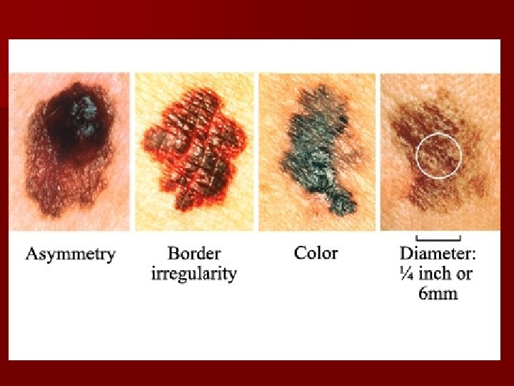 What is the ABCD rule? n Used for recognizing melanoma n A-Asymmetry: two sides of the pigmented mole do not match n B-Border irregularity: borders are not smooth n C- Color: lesion has a multiple of colors n D- Diameter the spot is larger than 6 mm in diameter (size of a pencil eraser)