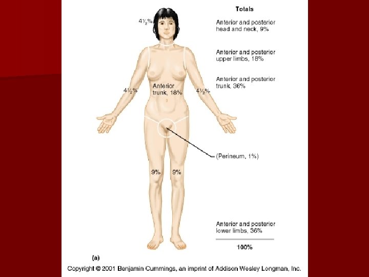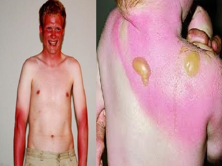 What are the 3 types of burns? n First-degree burns: only the epidermis is damaged. Redness, swelling and pain are common. (sunburn) 2 -3 days to heal n Second-degree burns: epidermis and upper layers of dermis. Blistering can occur. 3 -4 weeks to heal. n Third-degree burns: involves the entire thickness of the skin. (pg. 164 -165)