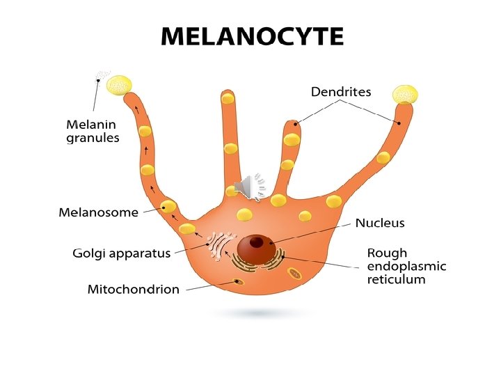 Melanocytes • They are originating from the neural crest • LM: they have rounded cell bodies, rounded nucleus with prominent nucleolus and long processes that extend between the surrounding cells • EM: the cytoplasm contains Golgi, r. ER, mitochondria, intermediate filaments and melanosome granules • The cells contain tyrosinase enz that converts tyrosine into dopa then into dopaquinone which converted into melanin. Melanosomes then move into the tips of melanocytes processes to be injected into the keratinocytes