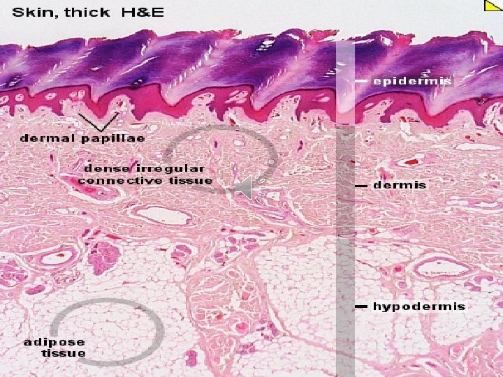 Histological Structure of Skin • Skin: • Epidermis: keratinized stratified squamous epithelium forms an outer waterproof shield. It is avascular and receives its nutrition by diffusion from the vascular superficial papillary layer of dermis. - Dermis: a tough, leathery layer of dense fibroelastic connective tissue. It is vascular. - Epidermis is fixed to dermis by hemidesmosomes, basement membrane and dermal papillae. • Subcutaneous layer (hypodermis): primarily adipose tissue (a thermoinsulator and a mechanical shock absorber). Often not considered a part of the integument.