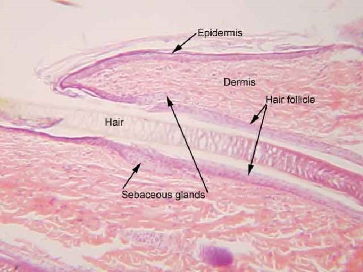 Epidermal Derivatives ► Hair: somewhat protective ( nose, eyelashes or from sun/cold) ► A hair (pili) consists of: Shaft: visible portion ► consisting of 3 layers of dead cells: 1. cuticle (outer) 2. medulla (inner) and 3. cortex (middle) 2. Root: portion of hair below surface, extends into the dermis and possible even hypodermis. Has the same 3 layers. 1.