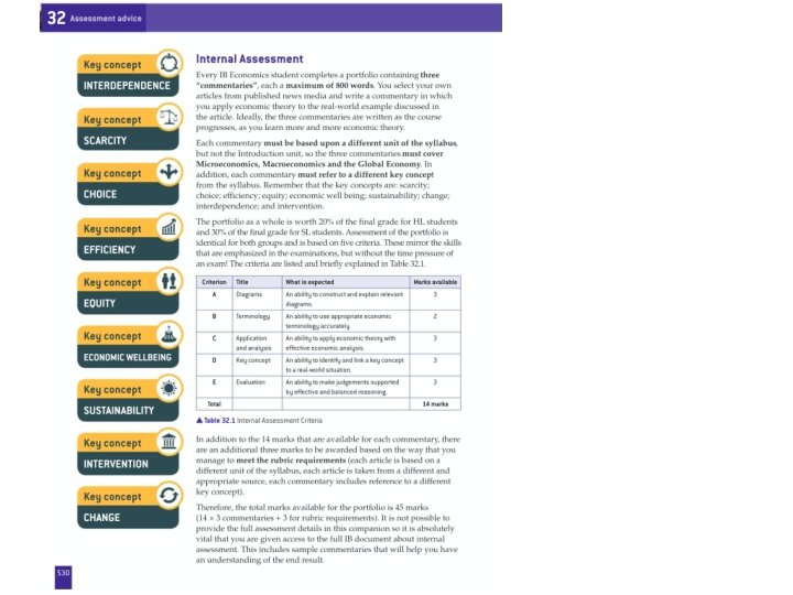 Overview There are five internal assessment criteria for each commentary. Criterion A Diagrams 3 marks Criterion B Terminology 2 marks Criterion C Application and Analysis 3 marks Criterion D Concepts 3 marks Criterion E Evaluation 3 marks Total 14 marks There is one internal assessment criterion for the whole portfolio. Criterion F Rubric requirements 3 marks Each commentary is assessed individually for the first five assessment criteria (criteria A–E) and then criterion F is applied to the whole portfolio. The maximum for the portfolio is 45 marks: (14 marks x 3 commentaries) + 3 marks = 42 + 3 marks. The assessment criteria are related to the assessment objectives.