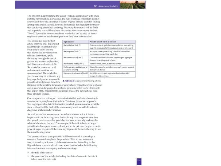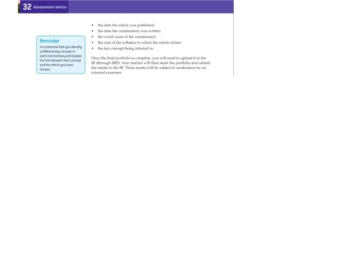 Internal Assessment • 1. Word limit • Students must produce a portfolio of three commentaries. Each commentary must not exceed 800 words. • 2. Articles • Each article must be based on a different section of the syllabus. • 3. Sources • Students must use a different source for each commentary. • 4. Contemporary articles • Students need to look for articles relating to current events and these must be published no earlier than one • year before the writing of the commentary.