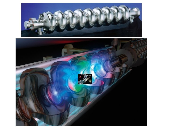 Accelerator Cavities standing wave higher-order modes damped p-mode superconducting 9 -cell ‣ RF power in Made with solid, pure niobium – it has the highest Critical Temperature (Tc = 9. 2 K) and Thermodynamic Critical Field (Bc ~ 1800 Gauss) of all metals. ‣ Nb sheets are deep-drawn to make cups, which are e-beam welded to form cavities. ‣ Cavity limited to 9 cells (~1 m long) to reduce trapped modes, input coupler power and sensitivity to frequency errors. ‣ Iris radius (a) of 35 mm chosen in tradeoff for low surface fields, low rf losses (~ a), large mode spacing (~ a 3 ), small wakes (~ a-3. 5 ).