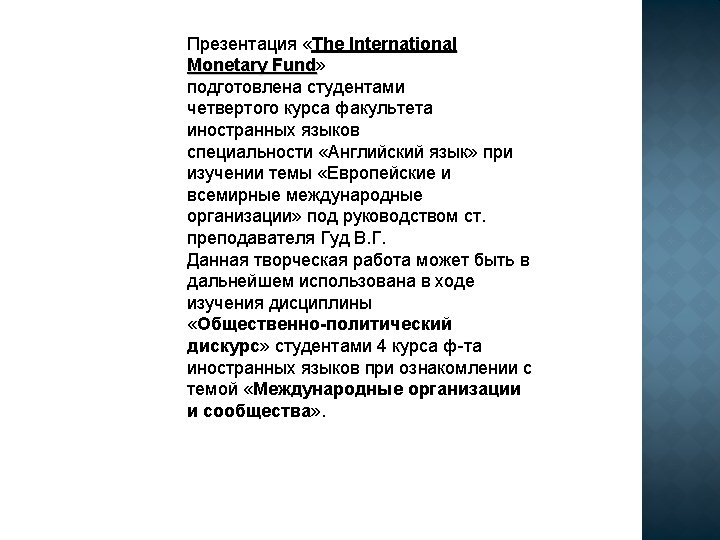 THE INTERNATIONAL MONETARY FUND INTRODUCTION IMF is a